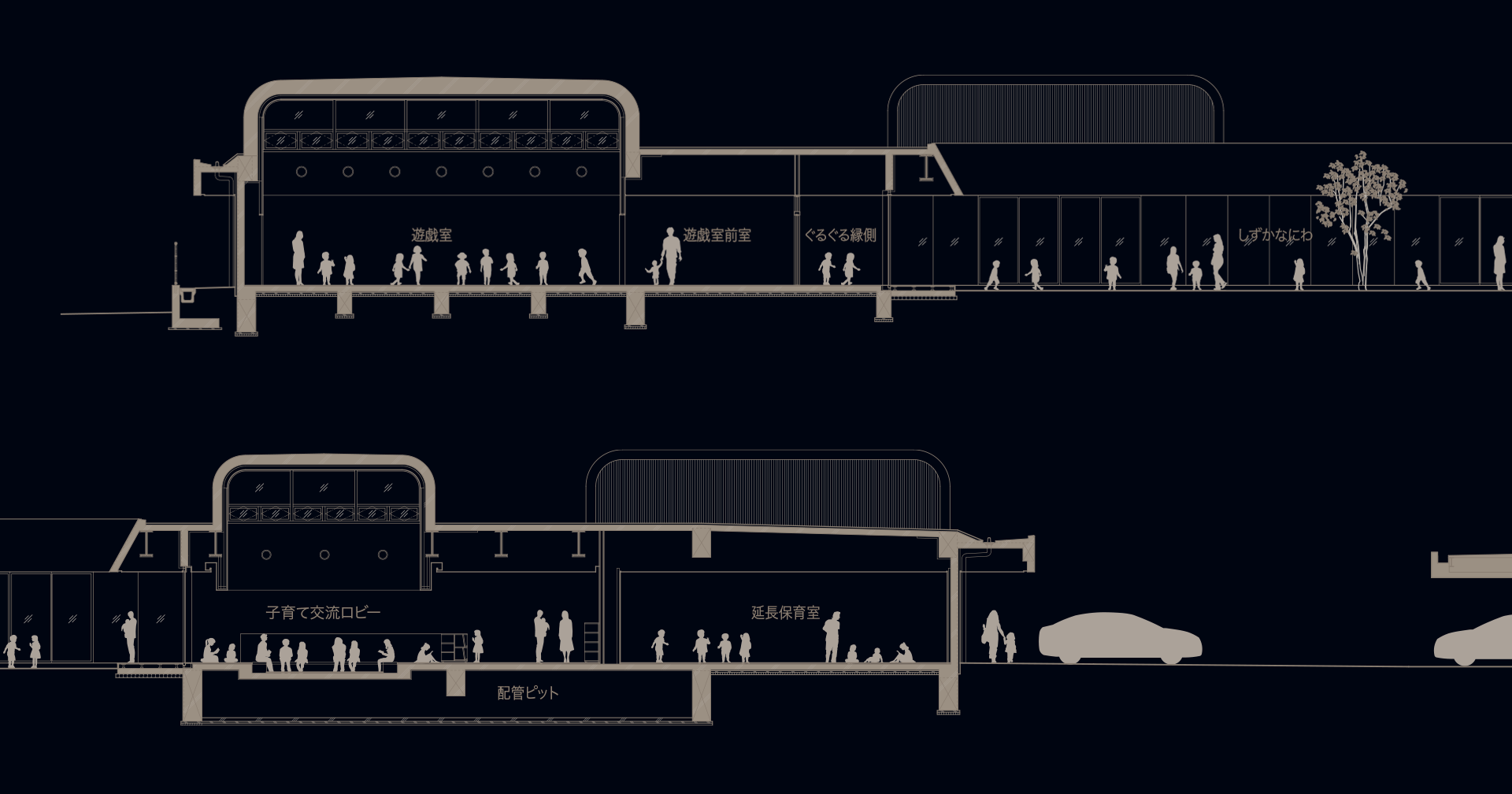 やわらかな曲面を持つゲートルーフは、子ども園の外観デザインの目玉でもあるが、これはRC造にしたことで実現できたと、奥村と小田は続ける。