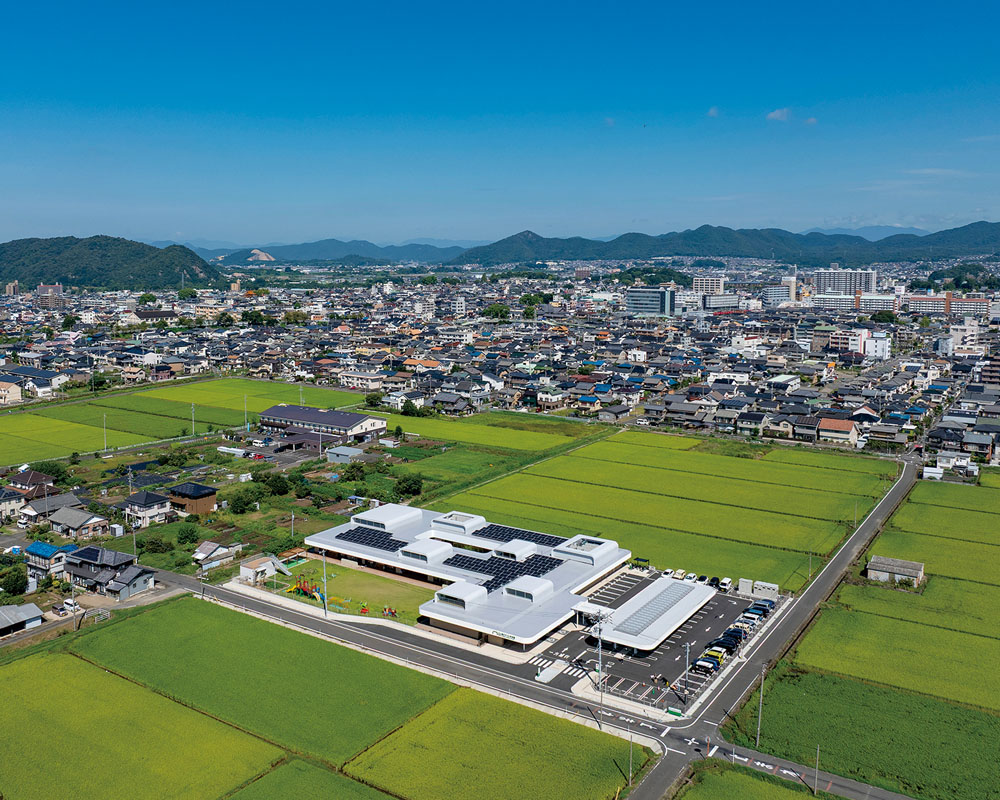 The site selected for this childcare facility—the first to be planned in Inuyama in some four decades—is located in a rural area surrounded on all sides by rice fields. Beneath a wide open sky, the single-story building stands out, with multiple gabled roofs rising from a flat roof plane, creating a striking presence even from a distance. Yukio Okumura, the design architect who led the project from the proposal stage and hails from a neighboring town, explains: