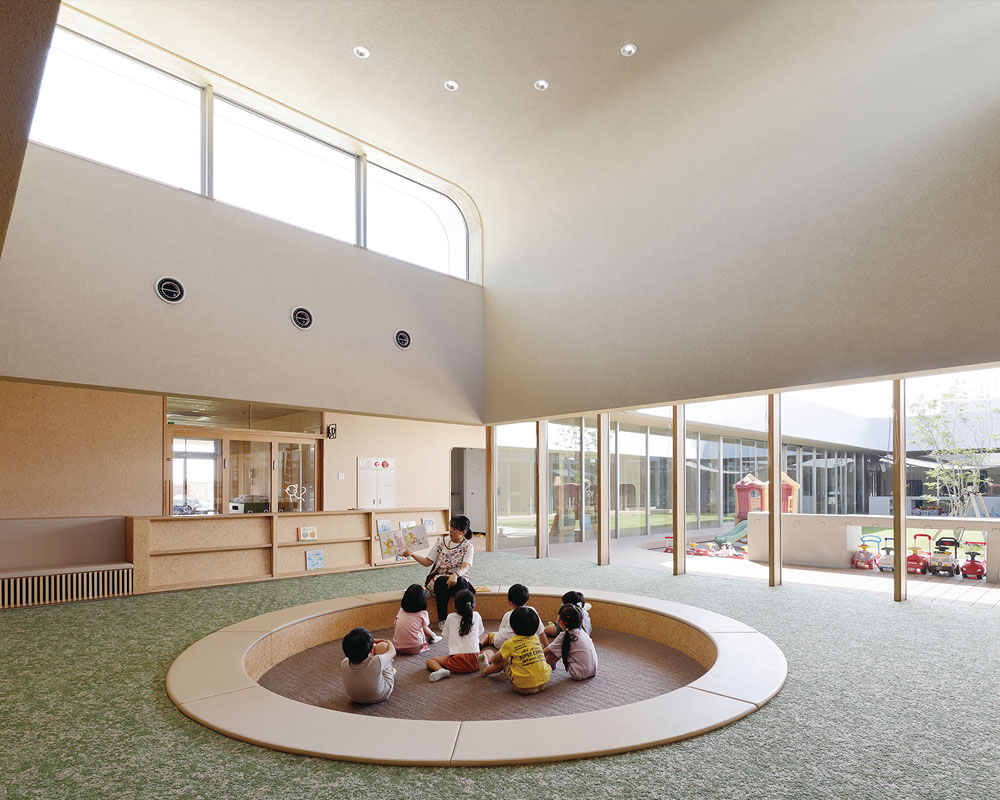 “There are many advantages to having a courtyard, such as improved visibility throughout the facility, the elimination of blind spots, and shorter circulation routes for caregivers. In this project, we considered how to relate the two gardens in order to encourage interaction among children of different ages, and placed a semi-outdoor terrace between them. This allows the gardens to be connected both visually and spatially. The semi-outdoor terrace also provides a safe place for children to play even under intense sunlight or on rainy days.”