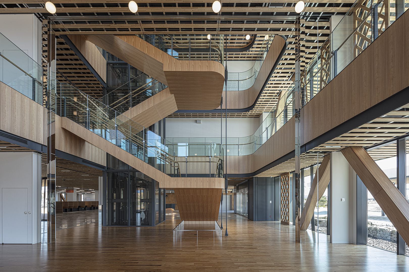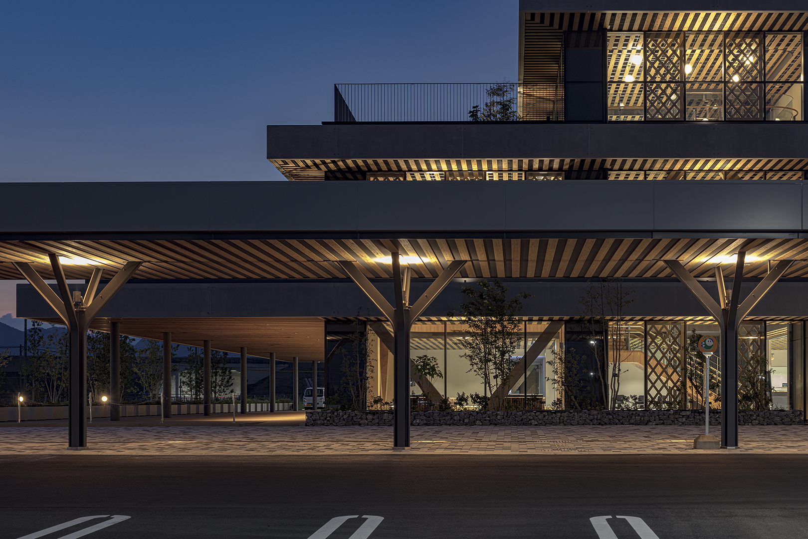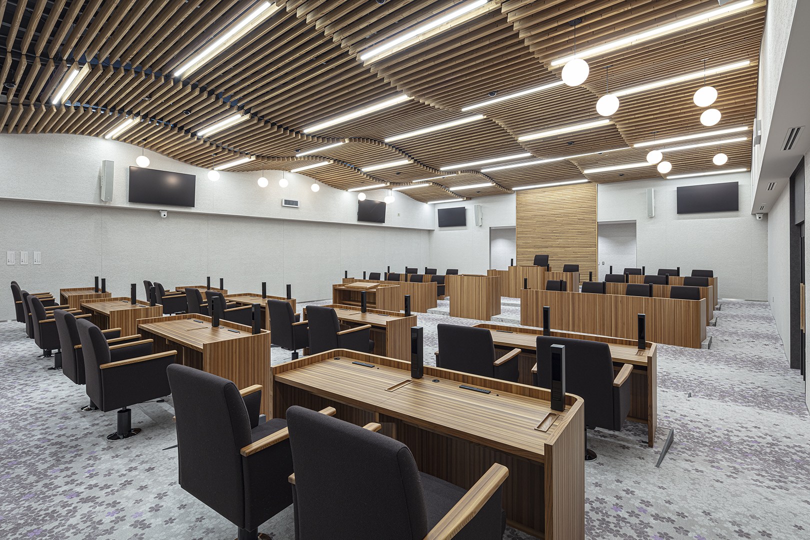 Administrative functions that had been dispersed across different districts were consolidated onto a new site and developed as a new government office building. The building was designed with a bright, open appearance, allowing the surrounding rich landscape to be enjoyed throughout the interior. Nearly ZEB performance was achieved through the adoption of exterior timber panels that combine thermal insulation and solar shading, the introduction of a radiant floor air-conditioning system using groundwater as a heat source, the promotion of natural ventilation through atrium spaces, and the installation of photovoltaic panels on the expansive roof. In the exterior landscaping, Usuzumi-zakura, the city’s symbolic flower, was planted, and a detention basin that also functions as a plaza, together with pedestrian paths, was developed to create a landscape design that connects seamlessly with the town.