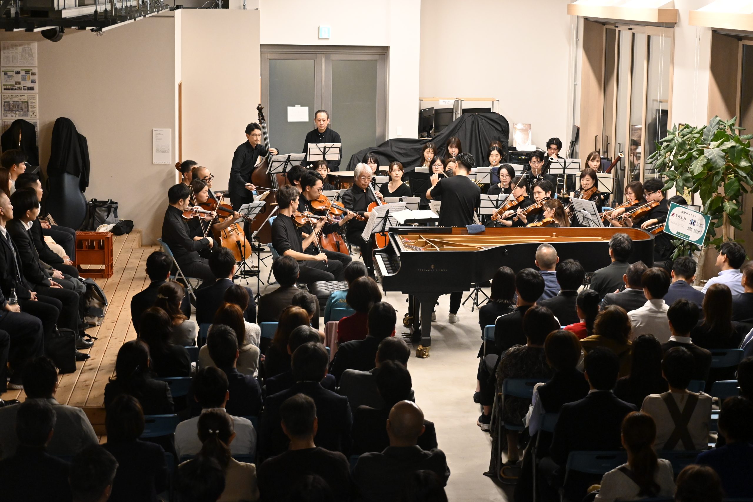 10月24日(金)に当社東京事務所「美土代クリエイティブ特区」1階にて建築と音楽がコラボレーションしたコンサート「不動産オケ(後援:平河町ミュージックス)」が開催されました。 不動産・建設業界の有志によるオーケストラが、ホールではないオープンスペースで特別な演奏をお届けする本企画。サントリーホール開館当初より数々の名演を支えてきたスタインウェイのグランドピアノが山田 剛史氏によって奏でられ、多くのお客様に演奏をお楽しみいただきました。
