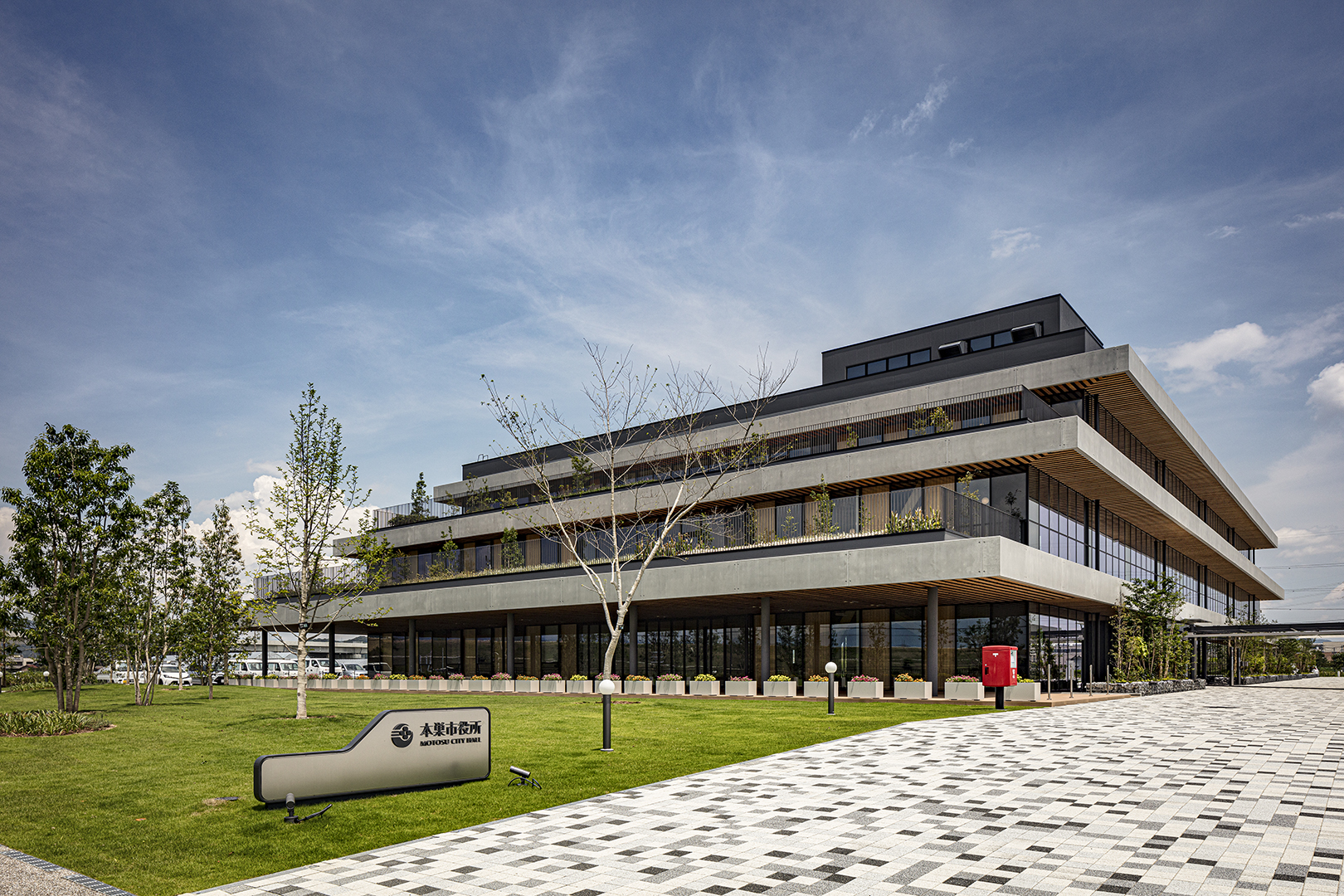 地域ごとに分かれていた役場機能を新たな敷地に統合し新庁舎として整備した。庁舎は明るく開放的な外観とし周囲の豊かな風景をどこからでも望めるようにした。また、断熱性と日射遮蔽機能を兼ねた外装木パネルの採用や地下水を熱源利用した床放射空調システムの導入、吹き抜けによる自然換気の促進、広い屋根を活用した太陽光発電設備の設置等によりNearlyZEBを実現。外構には市の花である淡墨桜を配置し、遊歩道や広場兼用の調整池を整備することで、まちとつながるランドスケープデザインを図る。