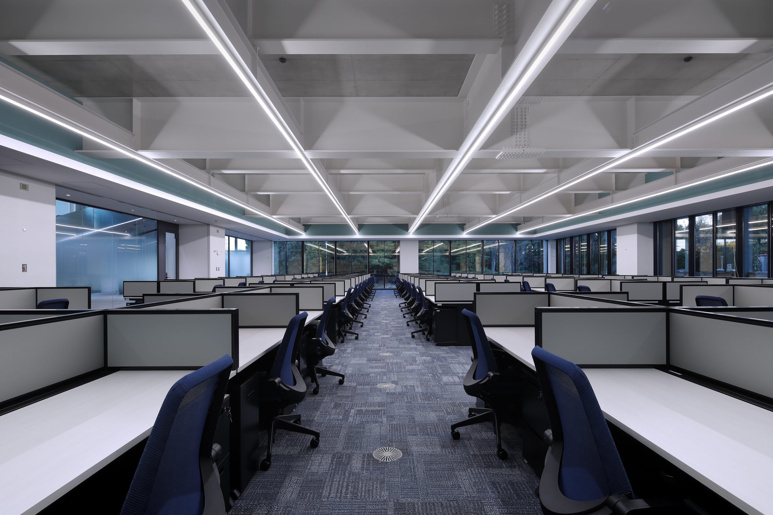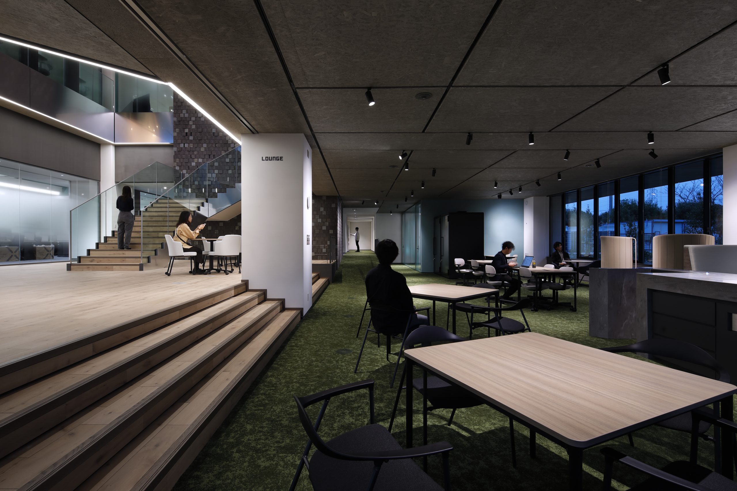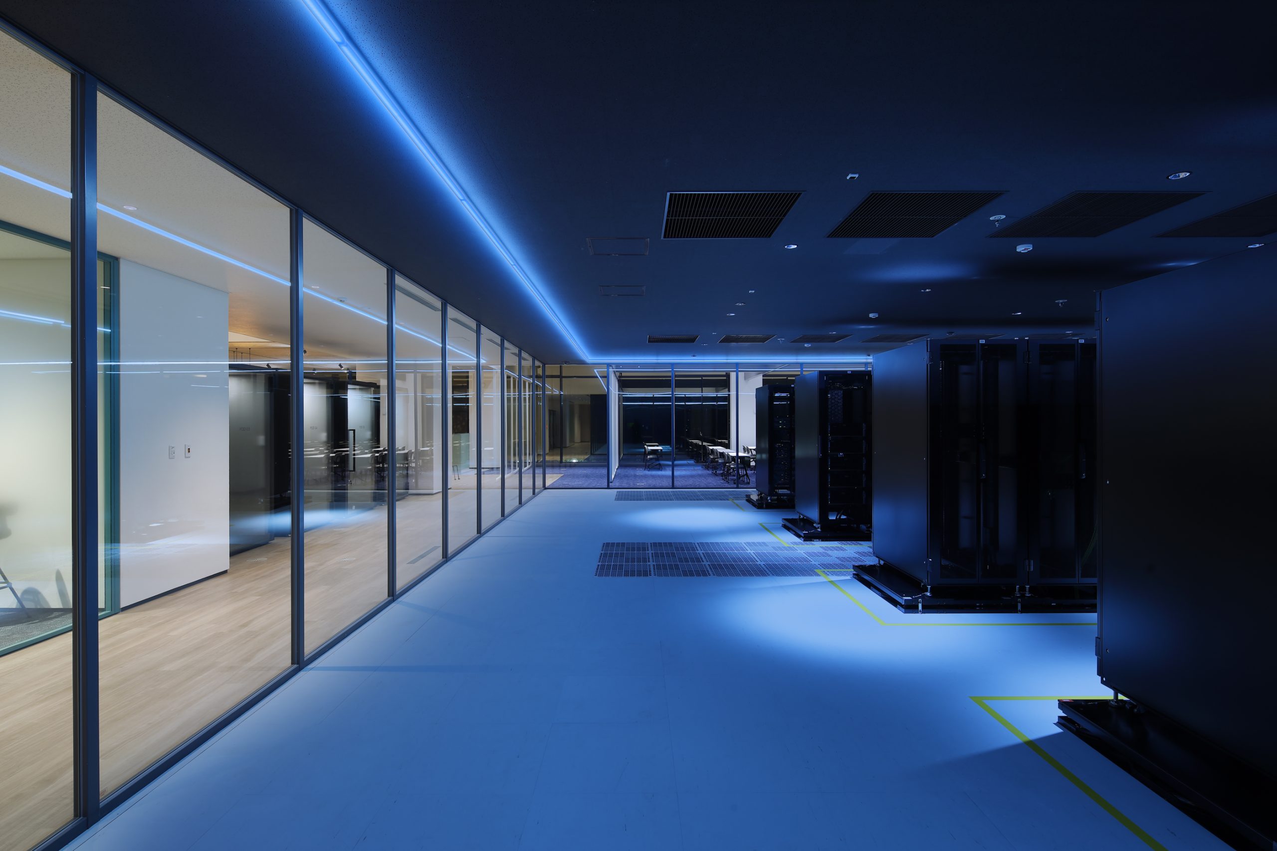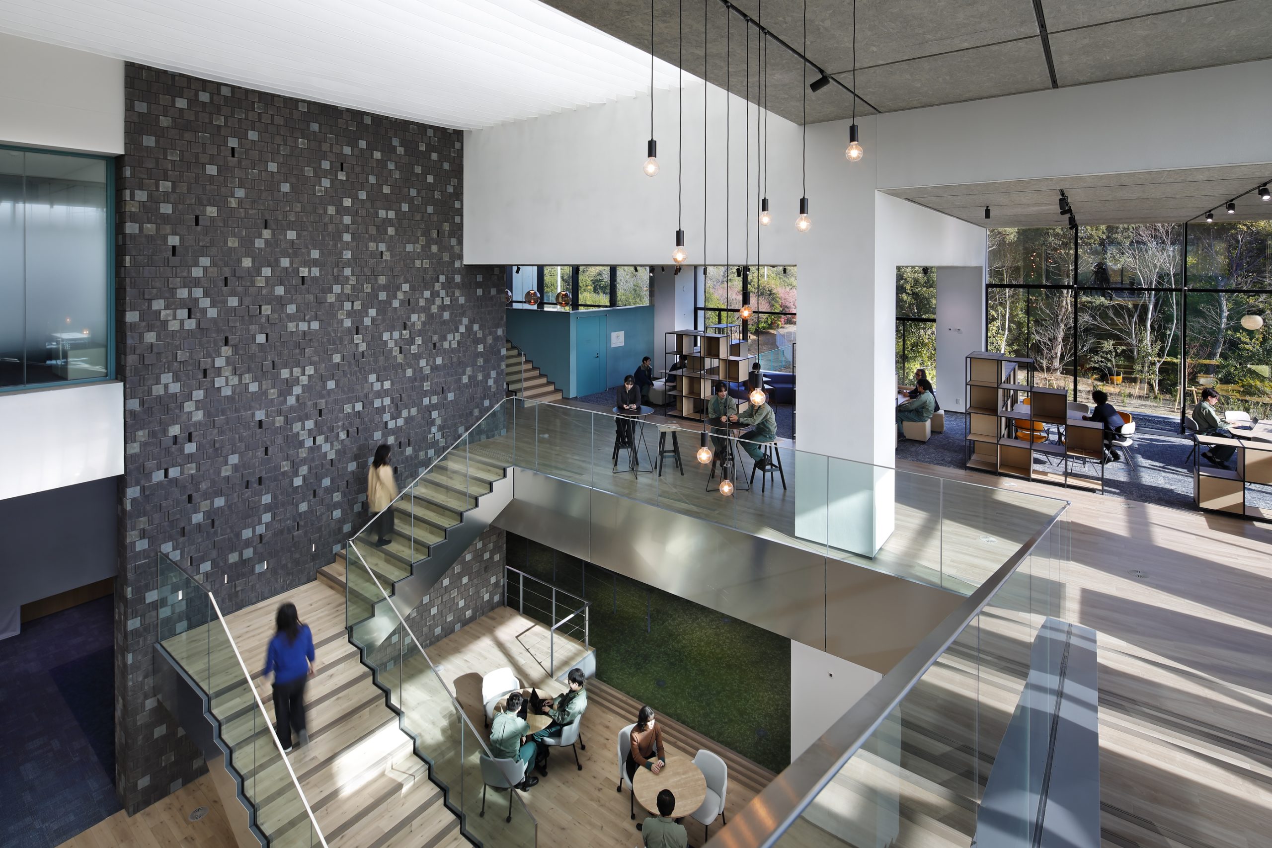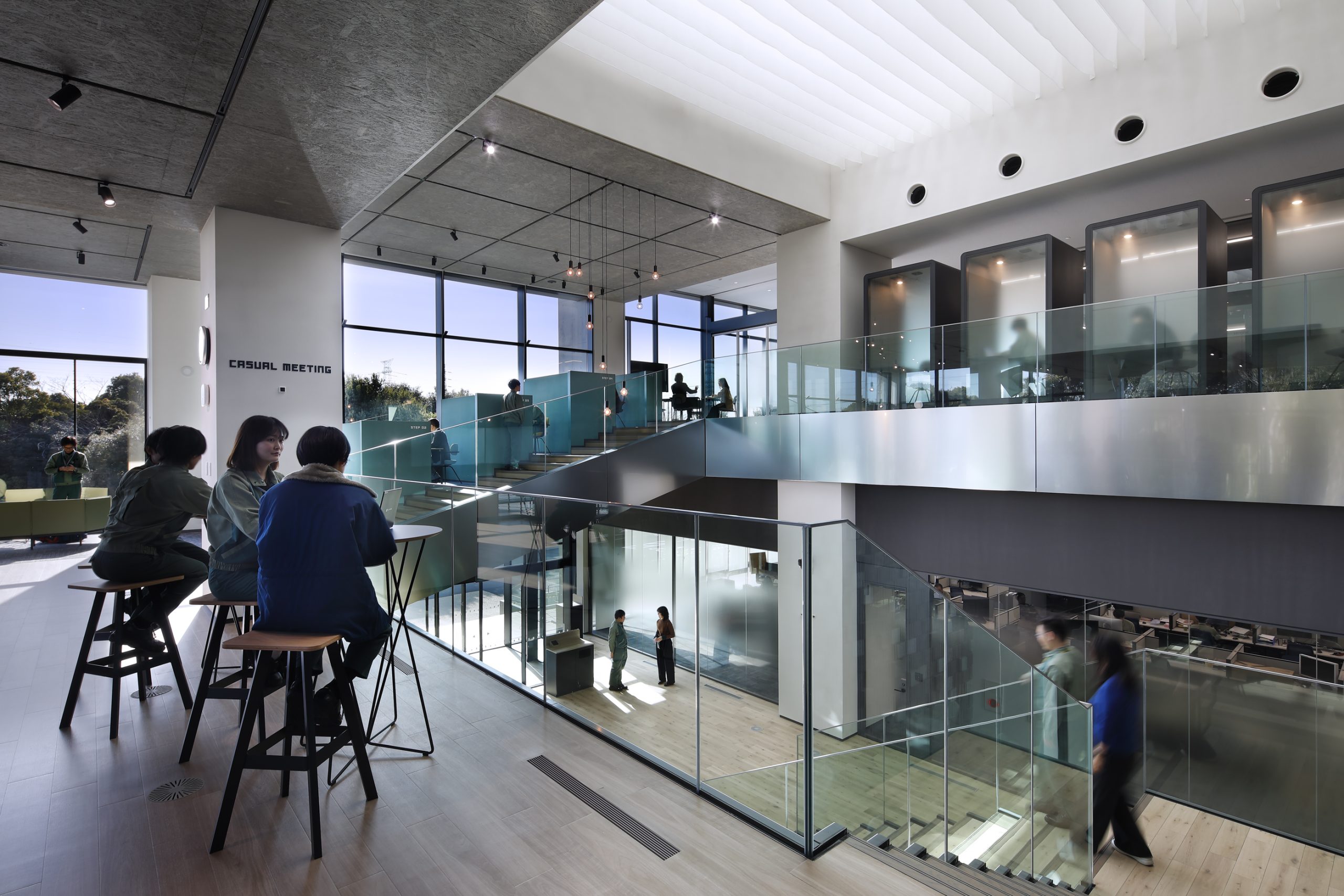 VISION HUB SODEGAURA内に点在している解析グループの『知』を集結させた研究所。スキップフロアで回遊性のある空間とすることで、人と関わり新たなイノベーションを起こすきっかけを作っている。 外観は多様性を表した『ACTIVE BOX』をアルミパネルのリボンで緩やかに包んでいる。ACTIVE BOXはエリアによって変化する床レベルや天井高さを外観にも表出アルミパネルのリボンは周囲の緑を映し出し室内の床レベルと合わせることで室内と屋外を繋げる役割を果たす。 透かしレンガで構成した『CONNECT WALL』から吹出す空調風とトップライトへ抜ける自然通風を活用し、建物全体に風の流れを生む。またトップライト下にファブリックルーバーを設けることで直射日光を拡散させたやわらかい光が届く。